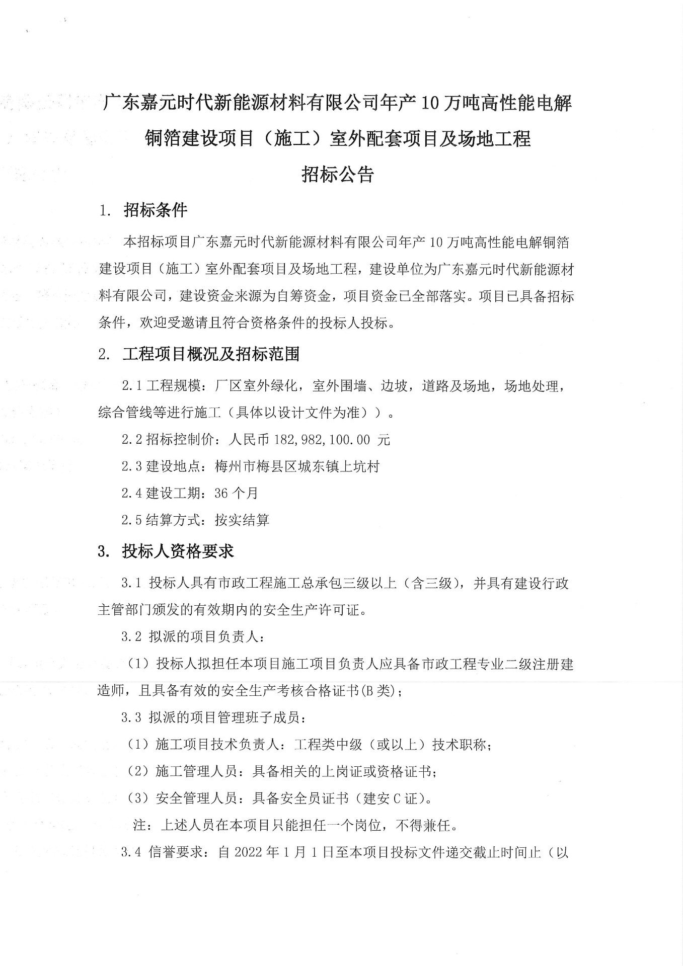 廣東嘉元時代新能源材料有限公司年產(chǎn)10萬噸高性能電解銅箔建設(shè)項目(施工)室外配套項目及場地工程招標(biāo)公告