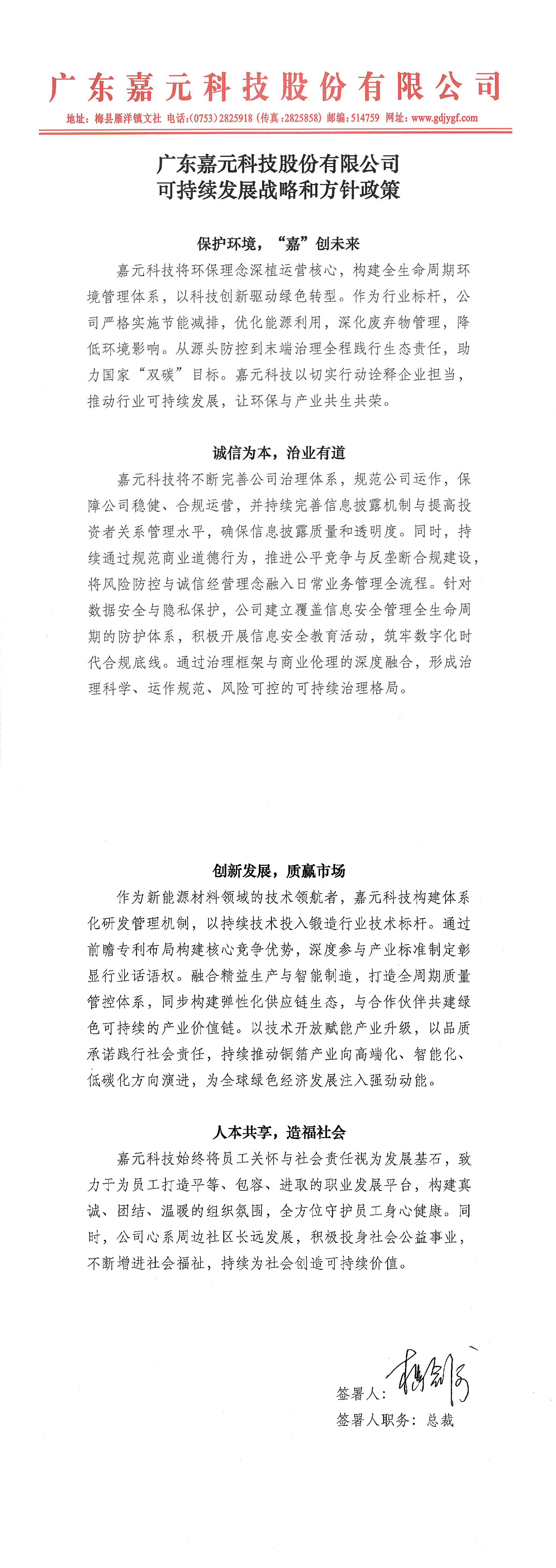 廣東嘉元科技股份有限公司可持續(xù)發(fā)展戰(zhàn)略和方針政策